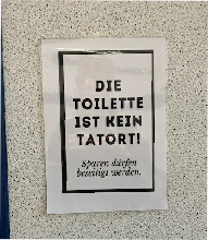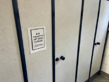 Schild vor Ort Tatort: Toilette ganz rechts